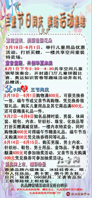 5月19日—6月1日购物满600元,可获兑换券一张,端午节或父亲节再购物,凭兑换券领取礼品,购买儿童用品及其它商品满600元,同时可获精美礼品一件(礼品赠完为止)。