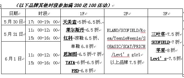 活动时间:活动期间,各楼层重点品牌参加超低折扣活动,参加品牌如下: