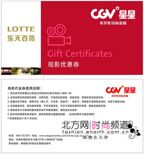 2011年9月23日至10月7日持乐天会员卡消费累计满300元,即可获赠CGV电影院观影特惠券(每人每日限兑换四张),凭此券在CGV星星国际影城东马路店观看2D,3D电影仅需25元,特惠券有效期至11月30日。