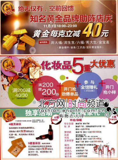 化妆品享有5重大优惠:满200减40/30、惊心时段满200赠200券、开门抢劲爆单品、参与全馆赠礼活动、开门抢小样。