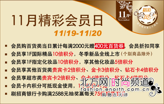 11月会员日活动,本月19日、20日,海信广场准备了《优雅加赠洁净有约》、《会员专享多倍积分》、《会员积分抵用现金》、《会员专享超市美食》、《银行刷卡美礼》等系列活动,1积分=1元。