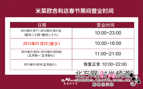 米莱欧百货:1月17日至21日,上午10点至晚上23点;22日上午10点至晚上18点,23日至29日上午11点至晚上21点,30日起恢复正常,上午10点至晚上22点。