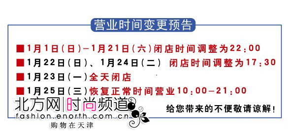 天津北方网讯:龙年春节在即,长达七天的假期,大家可以悠闲的选择逛逛街购购物,没有了节前的拥挤火爆,节日期间的商场会显得有些冷清,不过这何尝不是一个购物的好时节呢?可以体谅服务业也是需要过春节的,所以在春节期间津城各大商场的营业时间也是有所调整的。本期购物情报小编就为大家总结了天津各大商场的营业时间调整,希望对您的节日出行购物有所帮助。