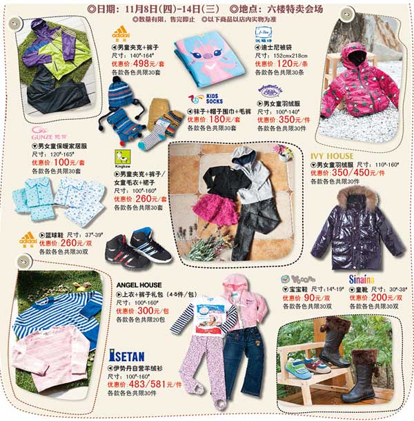 天津伊势丹冬季童装&杂品特卖,妈妈和宝宝们注意啦,11月8日(四)-14日(三)期间,天津伊势丹6层特卖会场举办冬季童装&杂品特卖活动!adidas、ANGEL HOUSE、KIDS SOCKS等众多童装、杂货品牌都会参加,还有有奖问答活动。