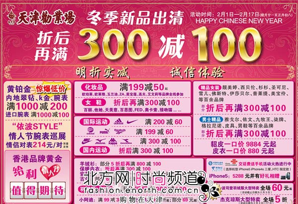 劝业场冬季新品出清,折后再满300减100,真正感受到“明折实减,诚信体验”,活动时间:2月1日--2月17日。