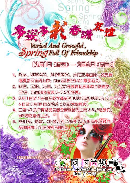 1、Dior、VERSACE、BURBERRY、杰尼亚等国际一线品牌春夏新品全线上市;Dior品牌举办VIP尊享酒会。2、娇兰、娇韵诗、雪花秀等品牌多档满额赠礼;海蓝之谜、SK-II等品牌春季护肤优惠套装全新发售。3、积家、宝珀、万国、万宝龙等高端腕表新款全球首发;宝铂、万国部分腕表8-8.5折特惠。4、朗姿、歌中歌、卡利亚里等精品女装春款全新上柜,联袂推出满额赠礼、新品鉴赏酒会等活动;3月1日至4日雅莹冬季商品满1000元送800元;3月6日至3月10日安莉芳内衣2折起大型特卖。