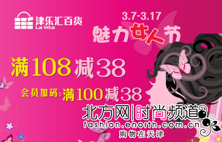 活动内容:津乐汇百货3月7日至3月17日,津乐汇魅力女人节满108减38,会员满100减38,3月8日当天全场3倍积分,消费388元可抽取旅游大奖,女性顾客任意消费可办会员卡并有好礼相赠!