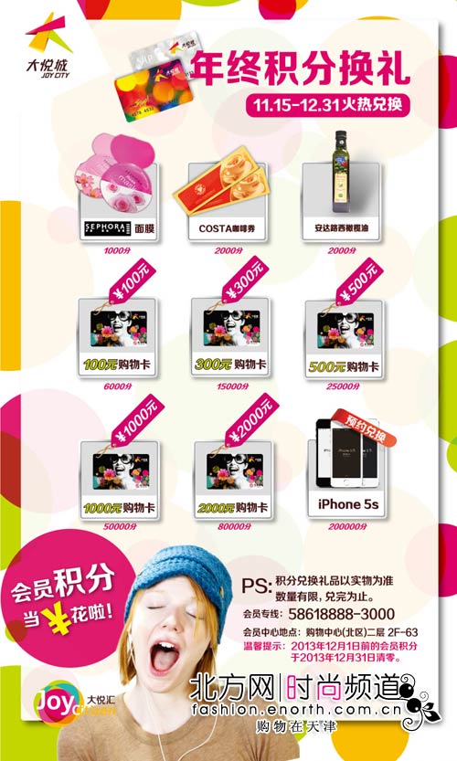 11月15日,天津大悦城“年终积分百万年终奖”全面启动,SEPHORA面膜、COSTA券、百元现金卡、千元现金卡、更有iPhone5s疯狂答谢。会员须持本人身份证及会员卡至北区2F会员中心兑换(每天10:00-20:30)。温馨提示:2013年12月1日前的会员积分将于2013年12月31日清零,大家一定要抓紧时间兑换。