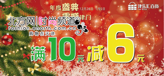 年度盛典震撼津门,津乐汇12月28日至1月5日消费满10元减6元,另有iPhone5S抽奖及满额赠礼等您拿。