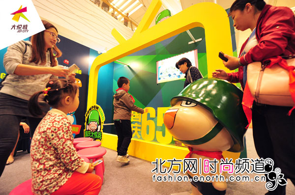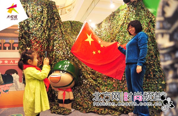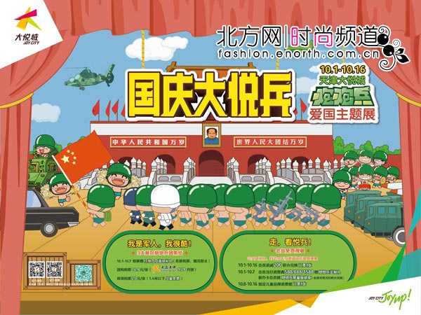 北方网时尚讯:什么才是最靠谱的十一假期?高速堵车,景区排队,游客被坑……快闪开!今年的十一正值建国65周年,天津大悦城吹响爱国集结号,一群肉肉脸的,脑袋大大的,带着绿钢盔的小兵操练起来。没错,这就是萌萌惹人爱的炮炮兵爱国主题展!