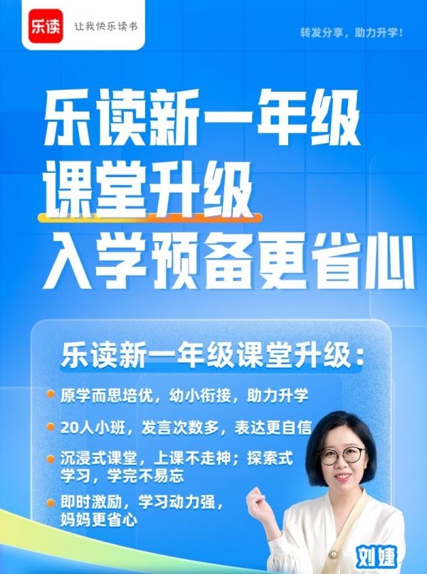 为了让孩子更好地适应小学生的身份,乐读对一年级小班进行了全面升级,推出新一年级20人在线小班,入学预备更省心。