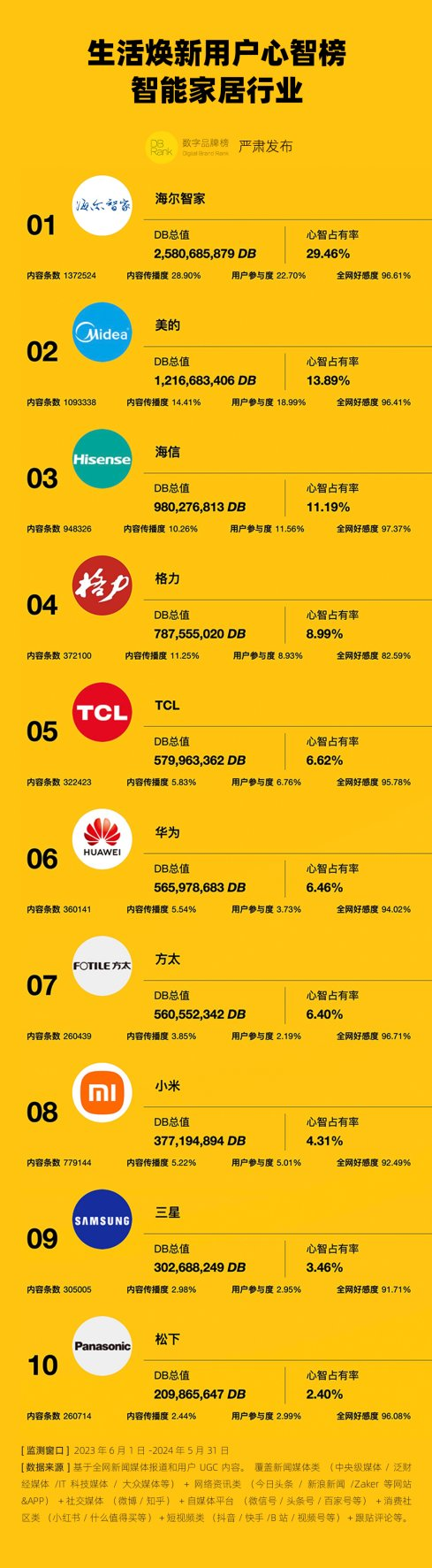 『数字品牌榜』以2023年6月1日-2024年5月31日为时间窗口,从智慧、健康、绿色、美居四大维度综合衡量,推出“生活焕新用户心智榜-智能家居行业”榜单,海尔智家以29.46%的行业内用户心智占有率位列榜首,是名副其实的家居生活焕新首选品牌。